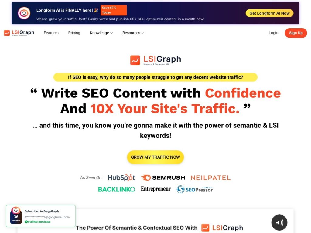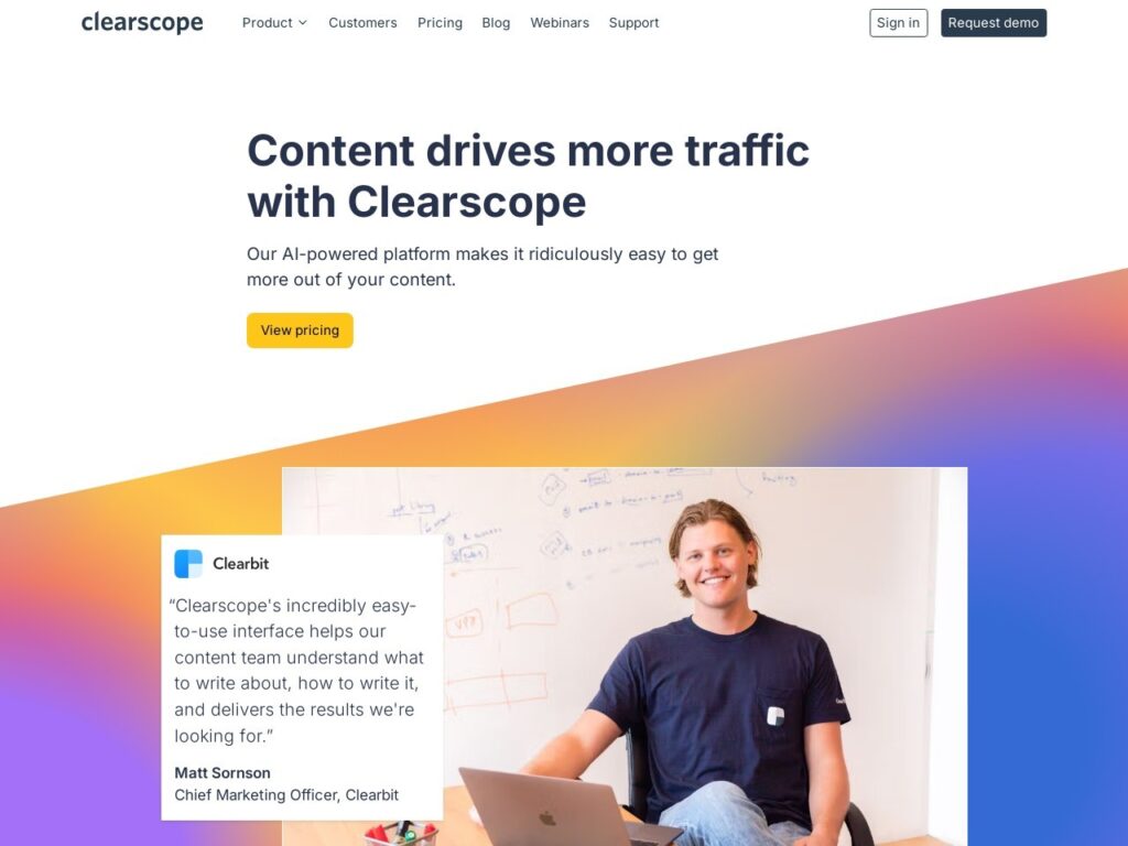 Clearscope: Content That Cuts the Noise – Feed it a keyword,and it benchmarks top SERPs—keyword counts (“SEO” 18x),word count (1,800)—with