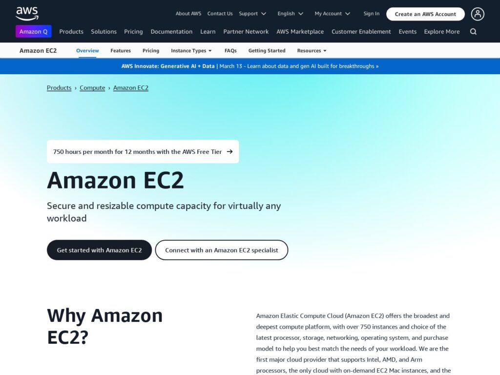 Amazon EC2 provides scalable cloud computing with deep AWS integration, ideal for developers building complex applications. Pricing starts at $0.01/hour,